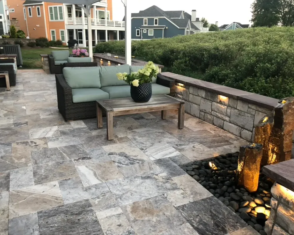 - Paver patios built with Techo-Bloc and Unilock materials selected for strength, drainage, and appearance