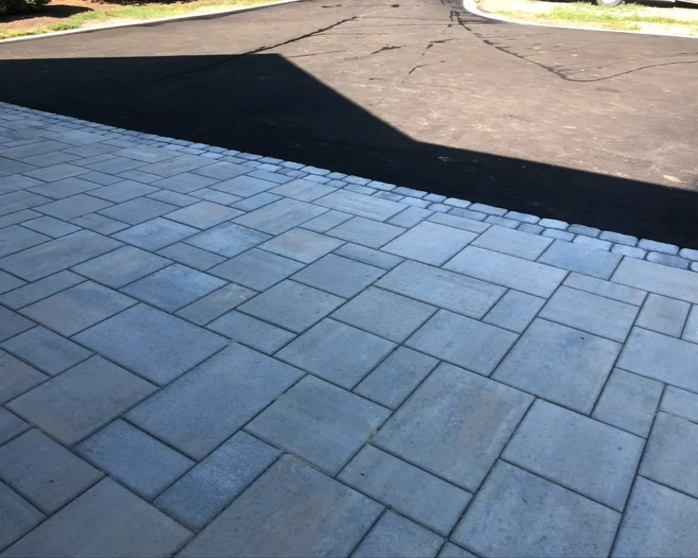 We installed Techo-Bloc Blu 60 and Blu 80 pavers in Champlain Grey, using a mix of sizes to create a durable surface with subtle visual movement. The layout feels solid and intentional, without drawing attention away from the home itself. A Villagio border in Shale Grey was added to frame the edges, helping lock in the pavers while giving the driveway and walkways a crisp, finished look.