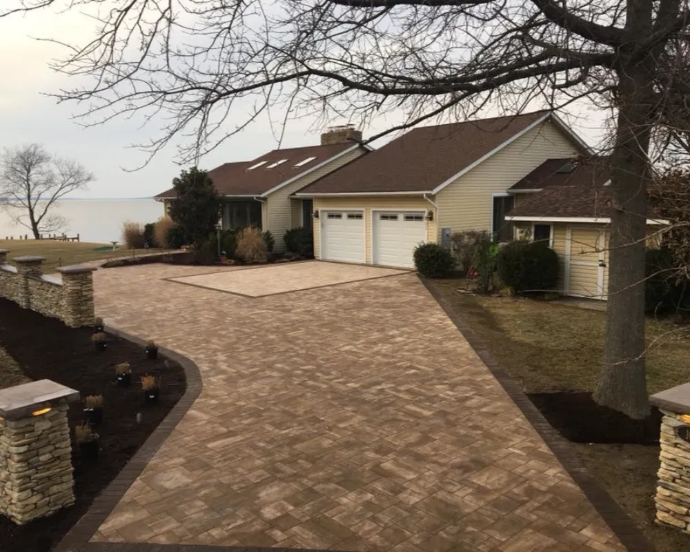 We installed a paver driveway using a blended color palette that complements the home’s exterior while providing a strong, uniform surface. A contrasting border was used to frame the driveway and walkways, adding definition and helping lock the pavers in place. A custom circular paver inlay near the garage creates a focal point that adds character without overwhelming the overall design.