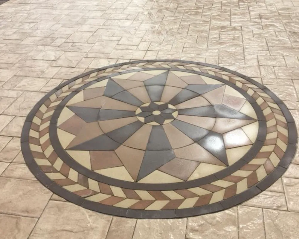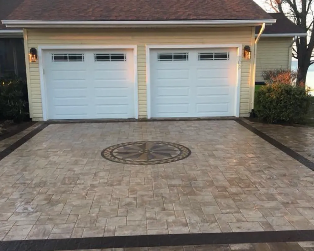 • Decorative Inlay: Custom circular paver inlay integrated into the driveway surface near the garage