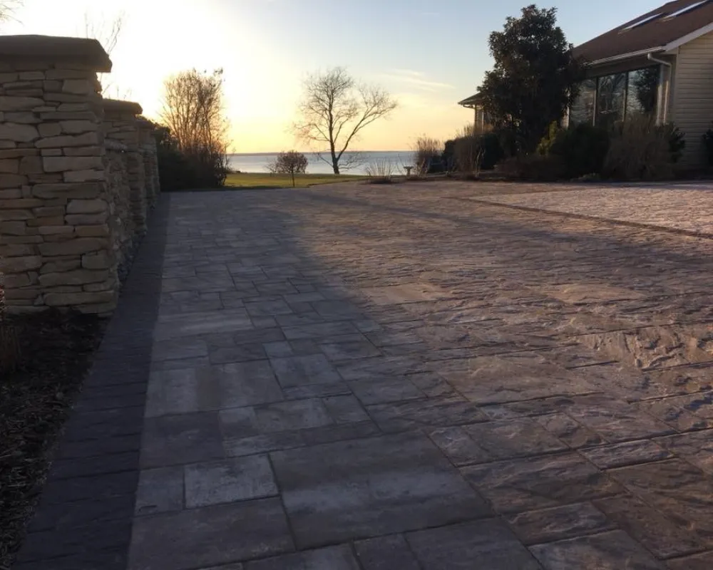 • Driveway Pavers: Large-format concrete pavers in a blended neutral tone, installed in a modular pattern
