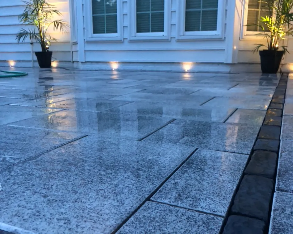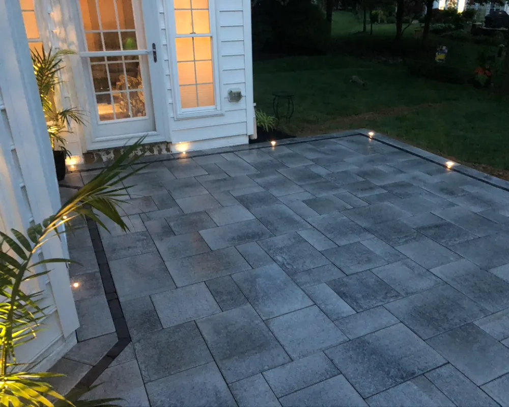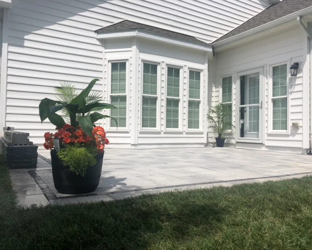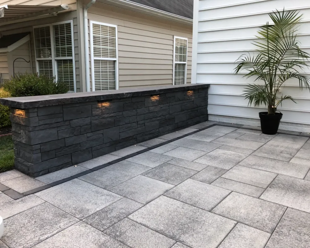 - Patio Pavers: Large-format concrete pavers in a cool grey blend, installed in a modular pattern